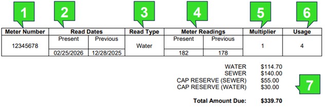 The following is an example of what a single-family bill might look like and how to read it: The below image is an example of how to read your bill, exact numbers may very